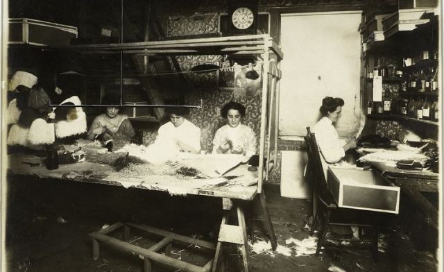 The photographic film below (produced by Merle Patchett for the exhibition) depicts photographs of women at work in plumage sweatshops taken from Lewis W. Hine’s photographic series documenting working conditions in New York, 1905-1939 (photographs courtesy NYPL).