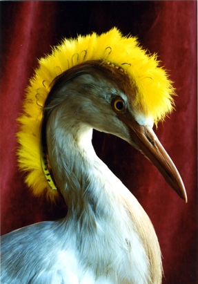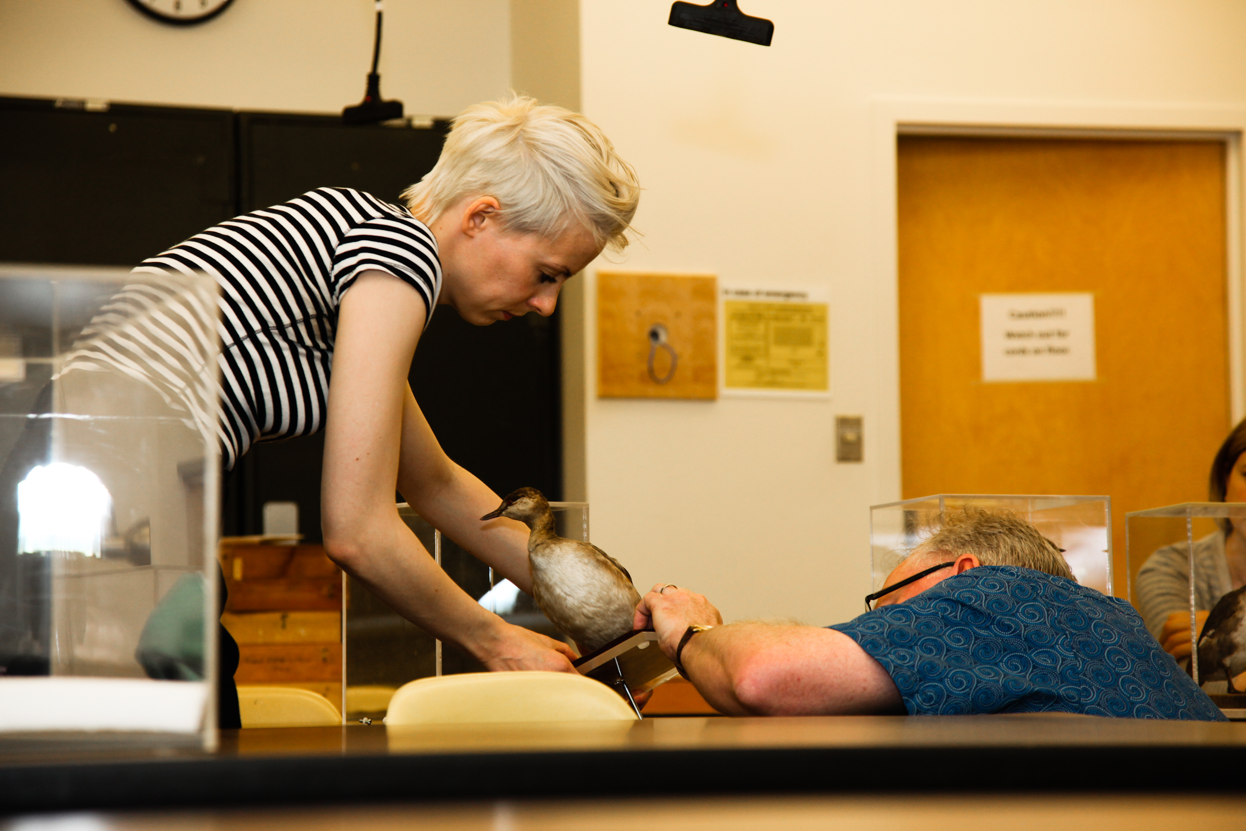 Merle (left) preparing a Horned Grebe that modelled work from Kate Foster’s BIOGRAPHY OF A LIE collection.