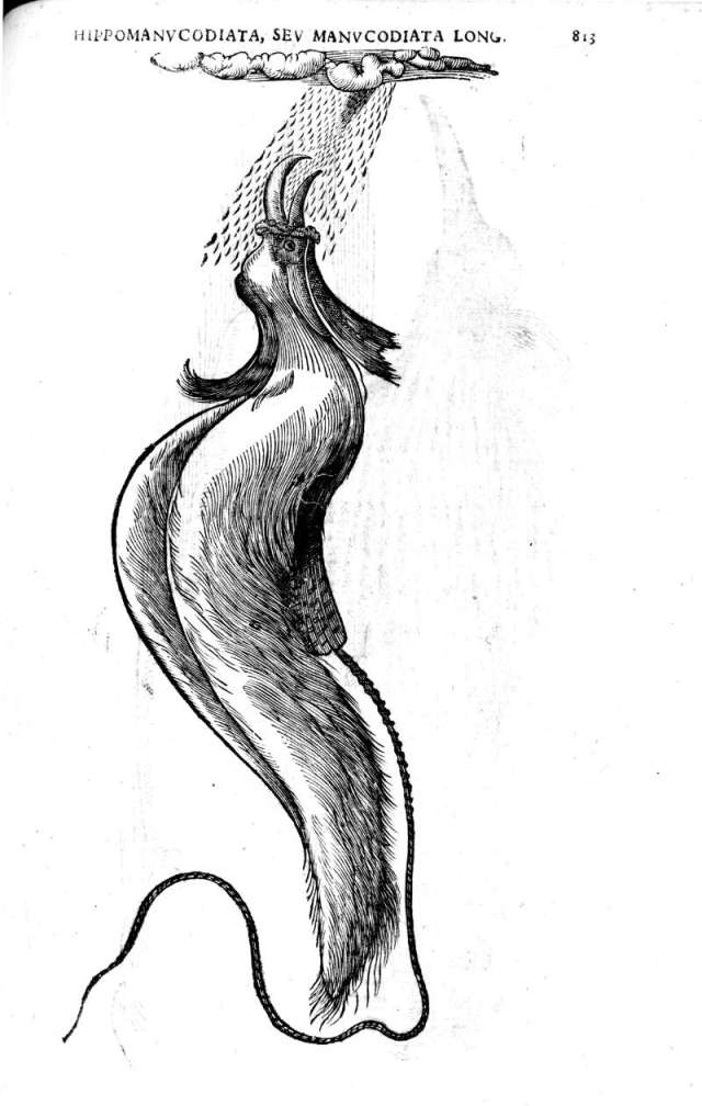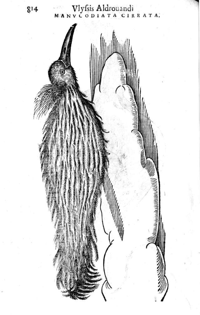 The mysteries of their lifestyle were suggested in a set of illustrations produced by Ulisse Aldrovandi for his encyclopedia Ornithologiae published in 1599. Considered one of the most respected naturalists of the period, Aldrovandi’s representations and descriptions substantiated the idea that the birds only lived on sky dew and sun rays and never landed even when breeding, the female apparently laying her eggs in a special cavity on the males back.