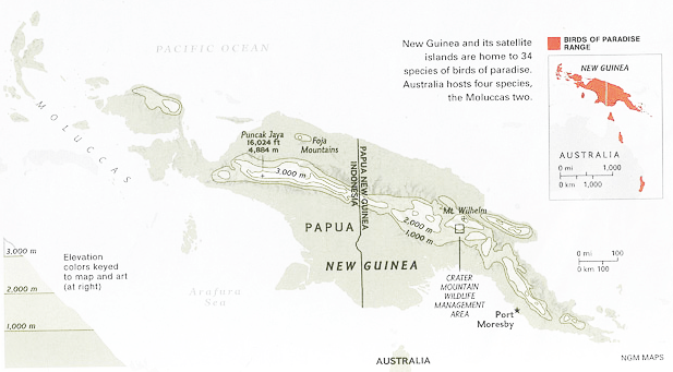 “[w]ith favourable ecological conditions in New Guinea – isolated tropical highlands, plentiful vegetation, few mammal competitors and virtually no predators – the Paradisaea could further evolve their dazzling features (a few species migrated to the Australian coast and the Moluccas). Apart from extreme sexual dimorphism their ornithological significance includes elaborate mating ritual and song, extremely long lives, nest decoration, manipulation of food, an unusual diversity in sexual relationships, and probably the highest interspecies hybridization amongst all birds’.[6]
