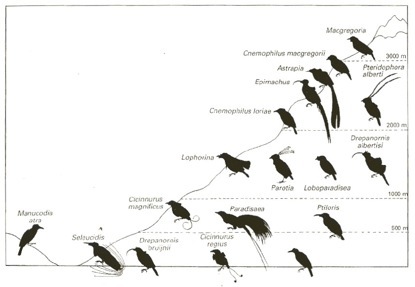 This figure illustrates how ecology has played an important role in BOP evolution, showing how different genera are partitioned within and among elevational zones. (From Frith and Beehler The Birds of Paradise: Paradisaeidae 1998)