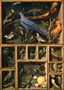 With the introduction of the five trade skins from the Magellan voyage to Europe, birds of paradise became a focus of scientific curiosity and study. The extraordinary beauty and rich colour of the bird’s plumes meant that trade skins were highly sought after by European cabinet collectors, who attained them through Europe’s growing plume trade with Indonesia and New Guinea. According to Pierre Belon’s Natural History of Birds, by the end of the 1540’s mounted birds of paradise were “a common sight in the cabinets of Europe and Turkey”.[4]