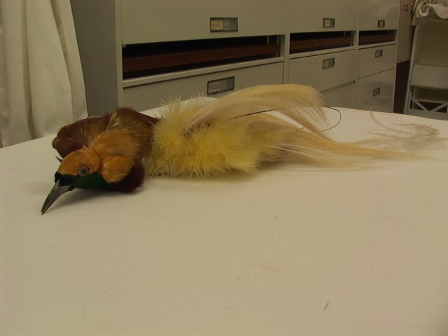 Lesser Bird of Paradise (Paradisaea minor) millinery prepared specimen. University of Alberta Clothing and Textiles Collection (UACTC). Photo: Merle Patchett
