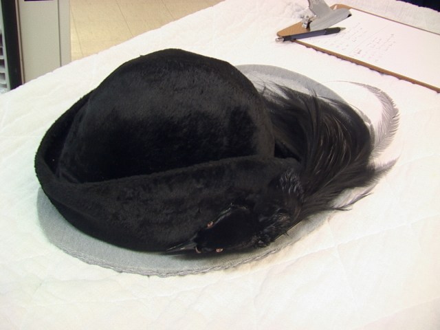 Dyed black Greater Bird of Paradise on silk plush hat c. 1910, UACTC. Photo: Merle Patchett