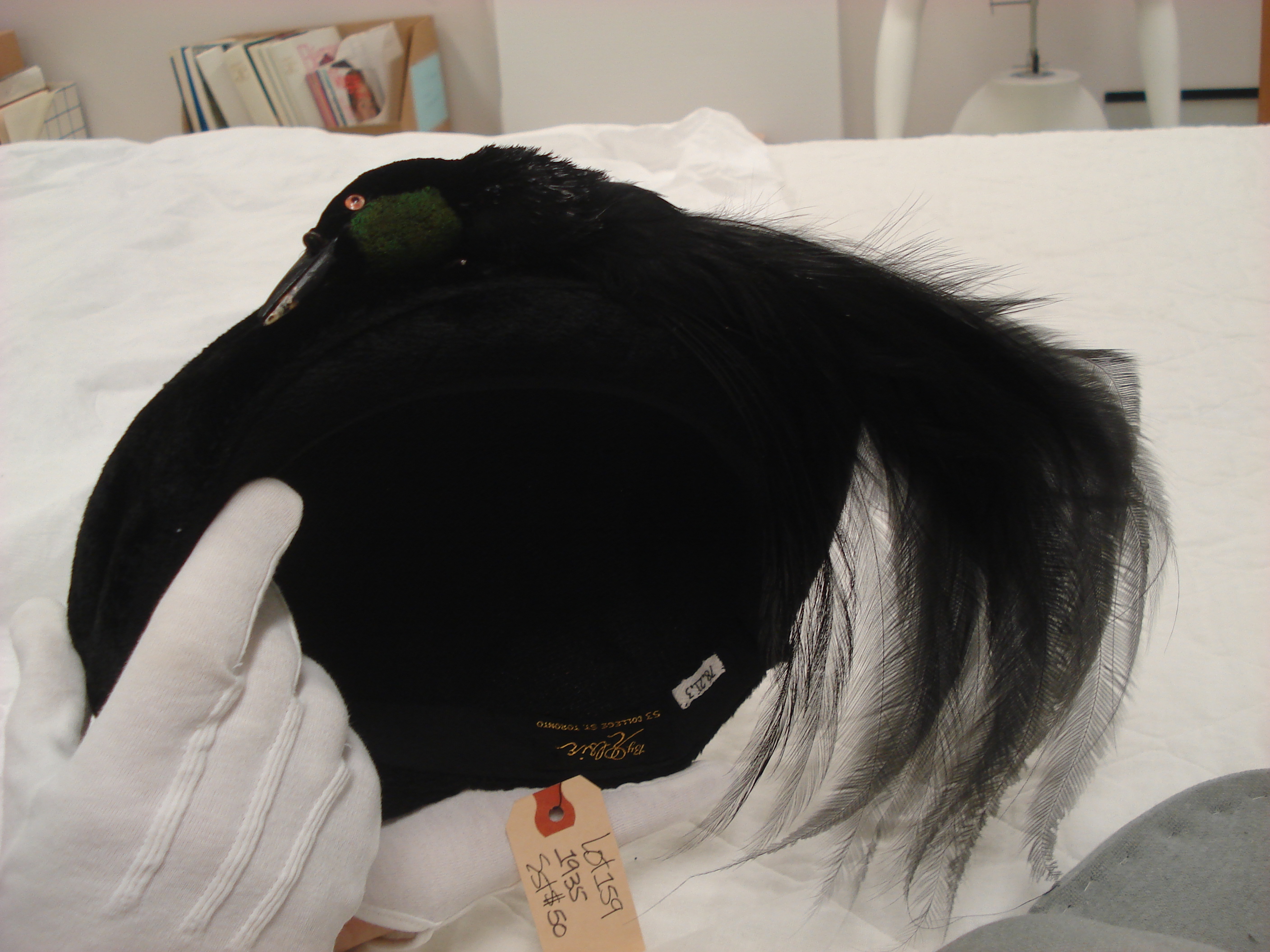 Greater Bird of Paradise (Paradisaea apoda) on silk-plush hat. Label states the hat dates 1935 and was bought in auction for $50. UACTC. Photo: Merle Patchett