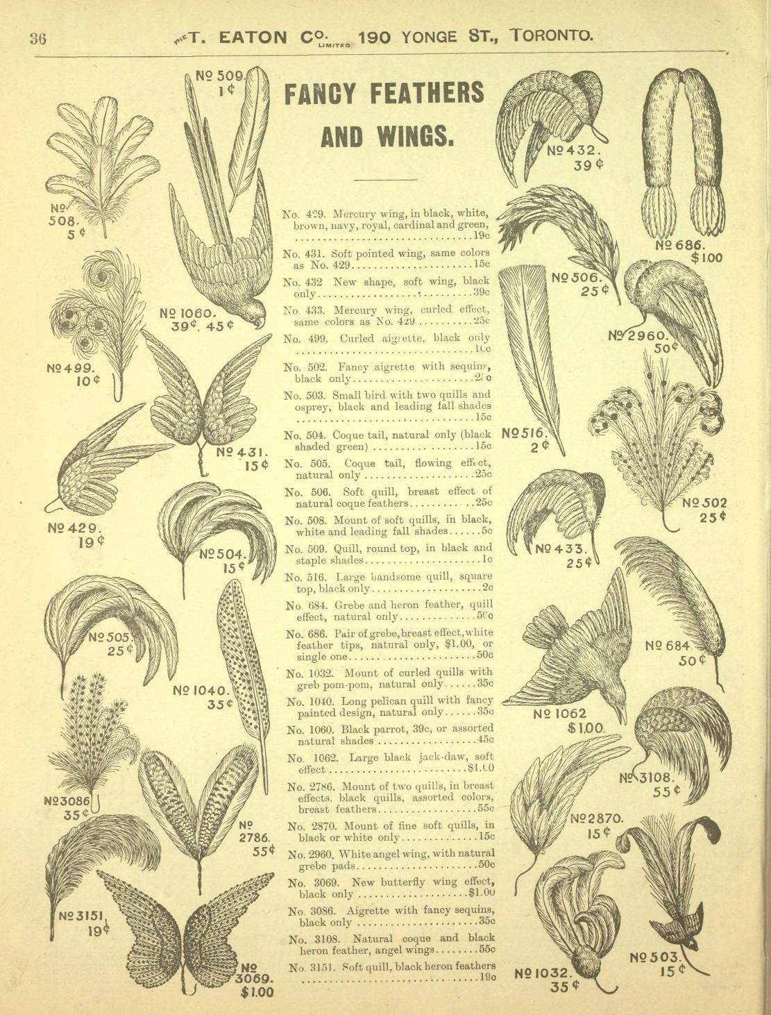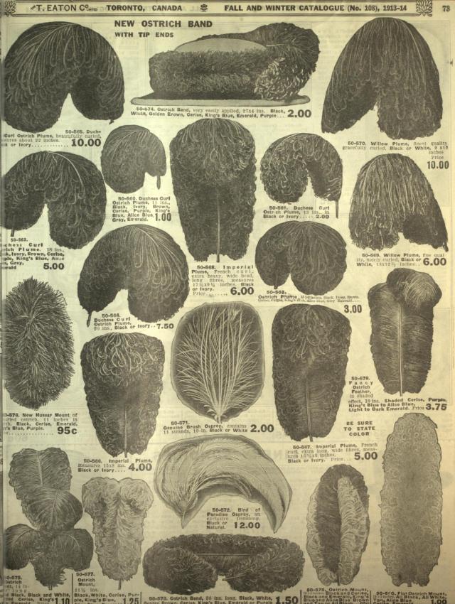 Eaton’s Catalogue page from 1913. Bird of Paradise Aigrette priced at $12 a small fortune for the time.