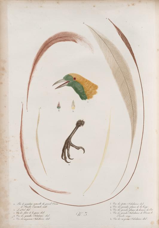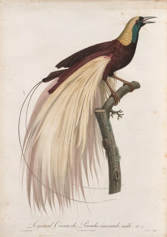 Levaillant commissioned Jacques Barraband, a well-known French artist, to make illustrations for his famous Histoire Naturelle des Oiseaux de Paradis (1801-1805). Barraband, considered the foremost ornithological artist in nineteenth-century France, was admired for his ability to bring his subjects (often simply preserved hollow skins) to life through conveying the texture of the feathers and the vivid coloration of the birds.