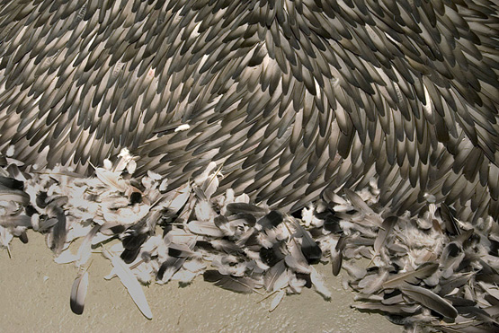 2. Kate MccGwire creates installations with feathers. These works are incredibly compelling and enticing, with their soft lustre and intricate construction, but they simultaneously disturb and repel, as the feathers pour, twist and flood spaces en masse.
