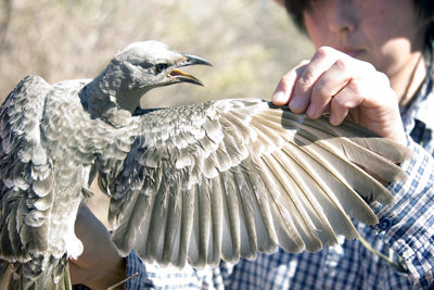 A bowerbird just before being released after banding by Class A birdbander Naoko Takeuchi (photo taken at Broome Bird Observatory). Photograph © Perdita Phillips