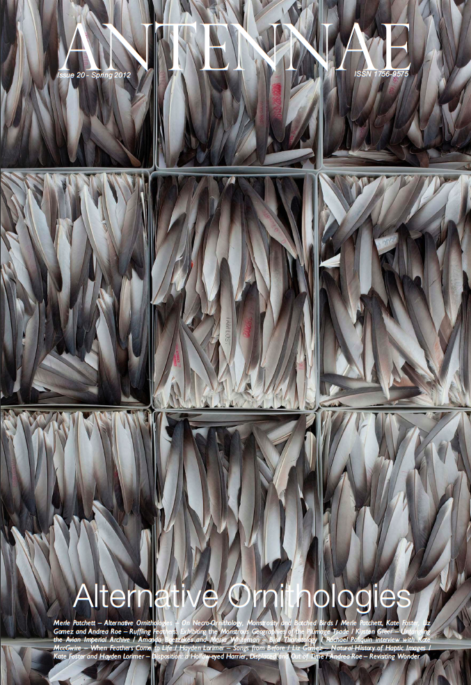 The 20th issue of Antennae is a rather special one from a number of reasons. First of all it marks the first five years of Antennae’s activity, and what five years these have been for animals and art! Second, this issue is a co-edited effort dedicated to art, plumage and birds. Merle Patchett has developed an international reputation based on her contribution to the subject of animal surfaces and geography. Curating the exhibition Fashioning Feathers provided the perfect platform to gather a unique army of artists and academics with a soft spot for the subject. Amanda Boetzekes, Kate Foster, Liz Gomez, Kirsteen Greer, Hayden Lorimer, Kate MccGwire, Marine Pacault, Rachel Poliquin, Perdita Phillips, Andrea Roe and Maria Whiteman have with their contributions, made this issue truly special.